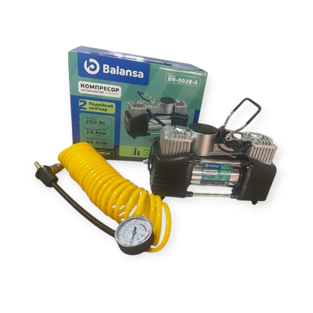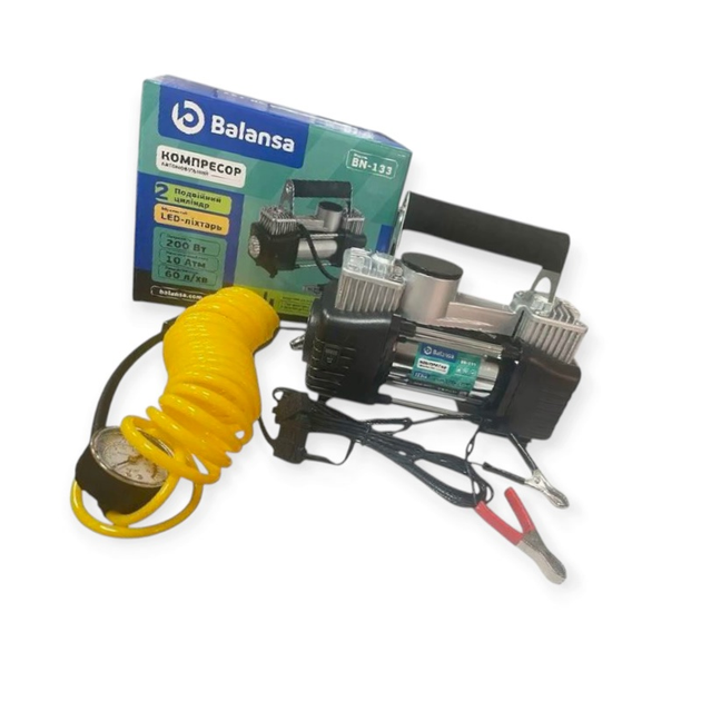 Компресор 2 цилін Balansa 200W, 10атм, 60л, 20А, 5м шланг спірал з ман, клемми, насадки, сумка, ліхтар