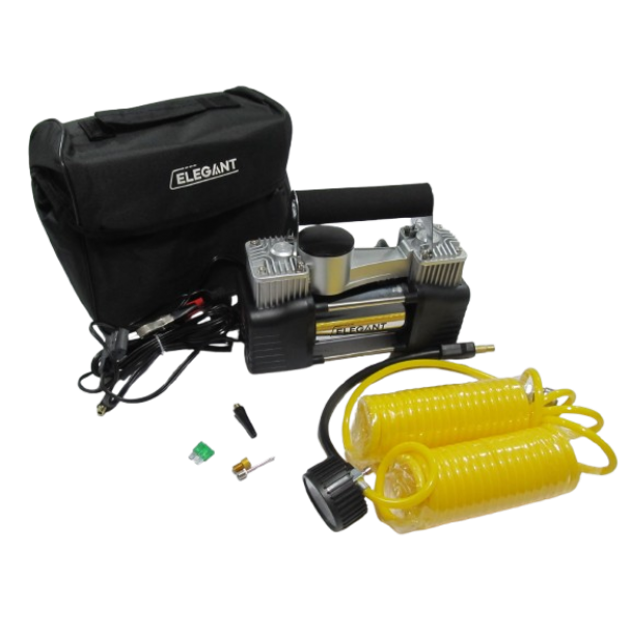 Компресор автомобільний ELEGANT 300 Вт, 2-поршня ,10 Атм, 90 л/хв, затискачі на АКБ, спіральний.шланг до 7.5м, провід 3м (60