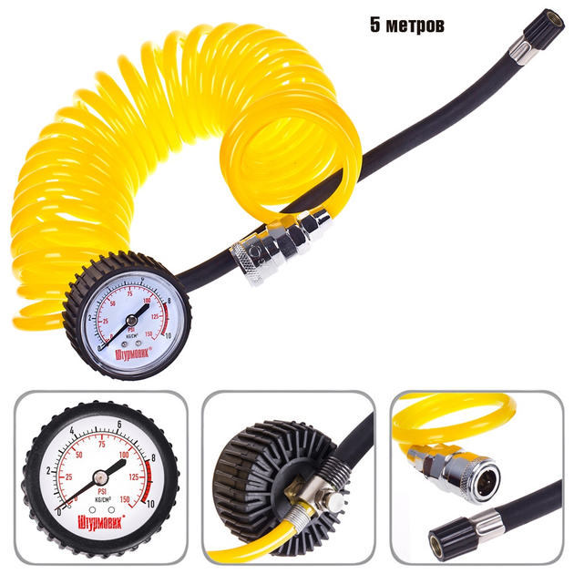 Шланг для підкачування коліс від компресора спірального під швидкозйом 5м манометр, дефлятор Штурмовик