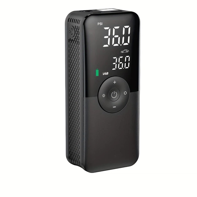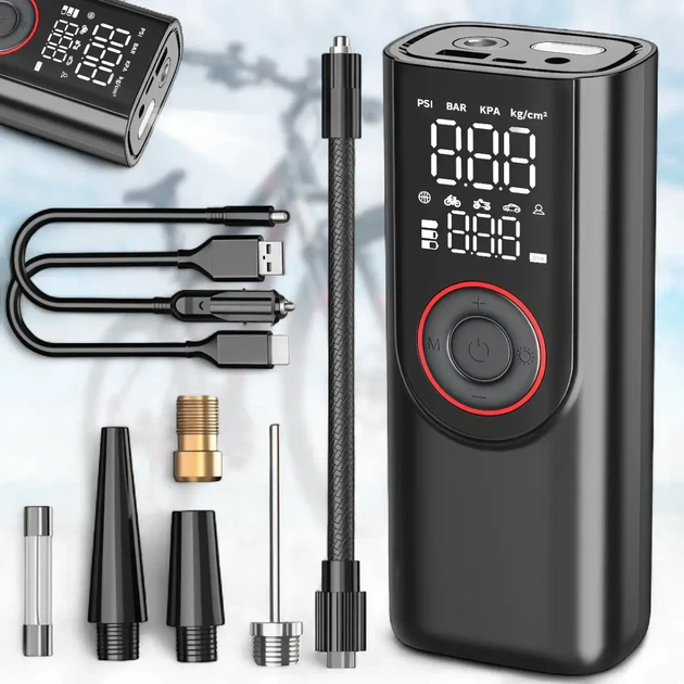 Портативний компресор з цифровим дисплеєм, LED-ліхтариком та набором насадок ATJ-9566 3х2000mAh
