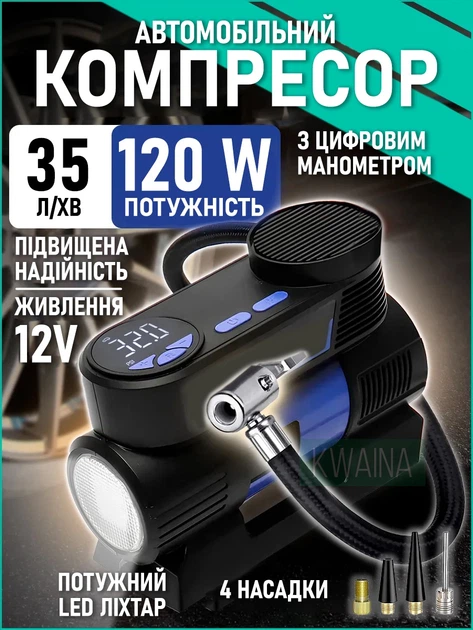 Насос портативний автомобільний повітряний компресор 12В з LED-дисплеєм, автоматичним вимкненням, ліхтариком та насадками в