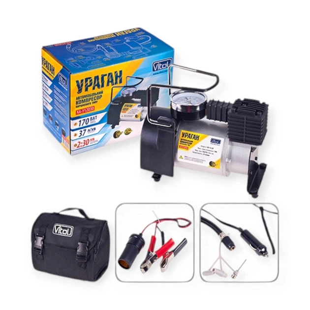 Компресор vitol ураган 10атм/37л/1,2м шланг/прик.-клеми/сумка