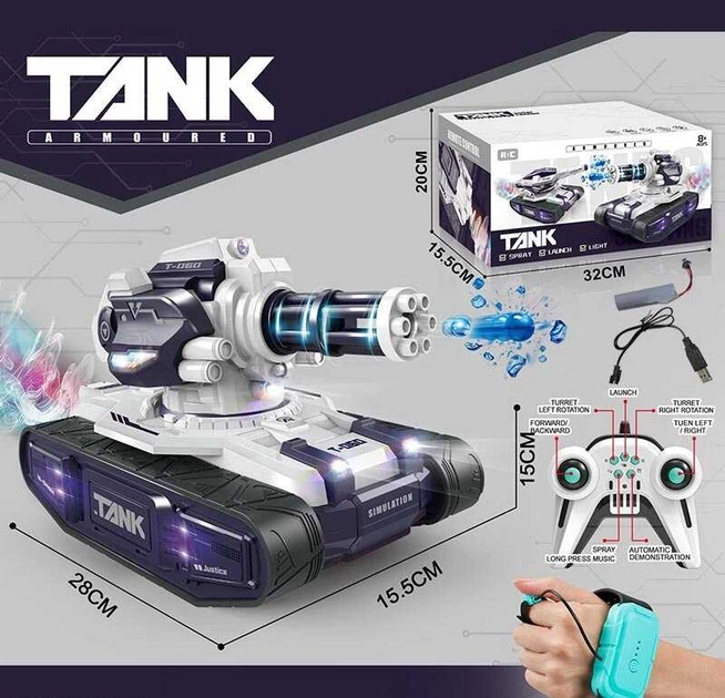Танк на радіокеруванні 399 D-9 пульт 2.4 GHz, аккумулятор 3.7 V, сенсорний браслет, стріляє орбізами, генерує пару, звуки, п