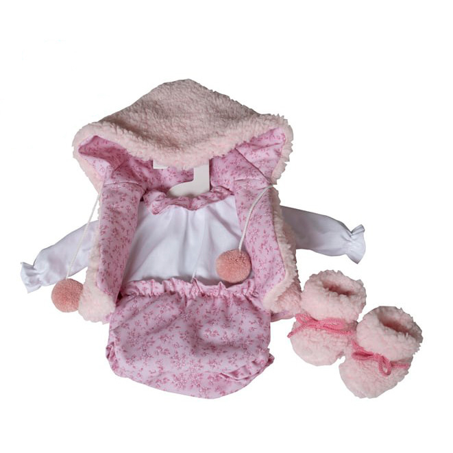 Комплект одягу для пупсів 45 см: двосторонній жилет + пінетки М'який жилет і пухнасті пінетки — ідеальний утеплений образ для ляльки 45 см. Жилет із зовнішнього боку має теплий однотонний колір, а всередині — ніжний рожевий з дрібним квітковим принтом. Пінетки пухнасті та приємні на дотик, дарують затишок і завершують образ.Характеристики