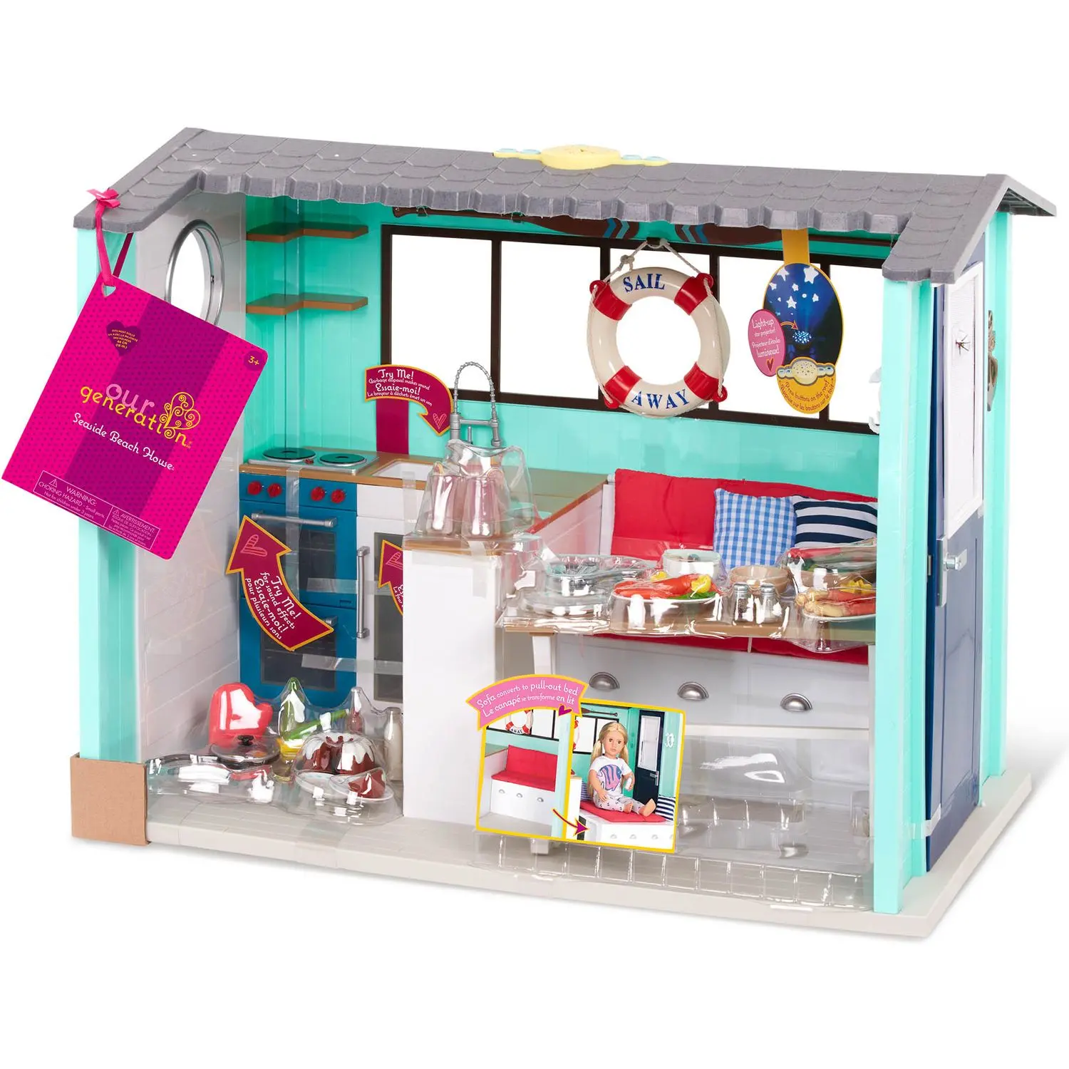 Ідеальний відпочинок в океані для вашої 18-дюймової ляльки Дозвольте своєму малюкові взяти свою ляльку на морський відпочинок, незалежно від того, де він перебуває, з цим пляжним будиночком від Our Generation. Обладнаний реалістичними предметами інтер'єру, які вони бачать у власному домі, такими як обладнання для кухні, інгредієнти для приготування їжі та навіть стельові світильники.