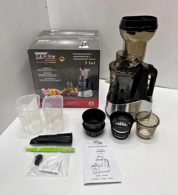 Соковижималка-морозивниця Zepline ZP-6058 3 в 1 потужністю 3000 Вт шнекова з чашею об'ємом 0.3 л та функцією холодного віджи