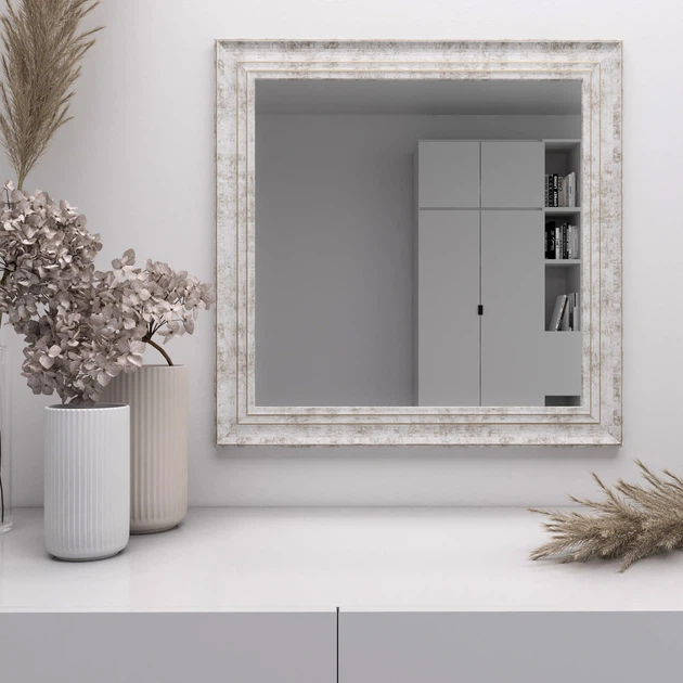 Дзеркало настінне прямокутне у рамі білого кольору з МДФ. Висота габаритна 80см, ширина габаритна 80 см, ширина профілю 50 м