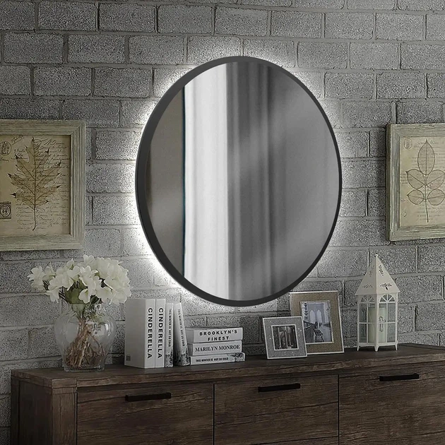 Кругле настінне дзеркало з підсвіткою і сенсорною кнопкою Лайн Ольян діаметром 60 см колір чорний