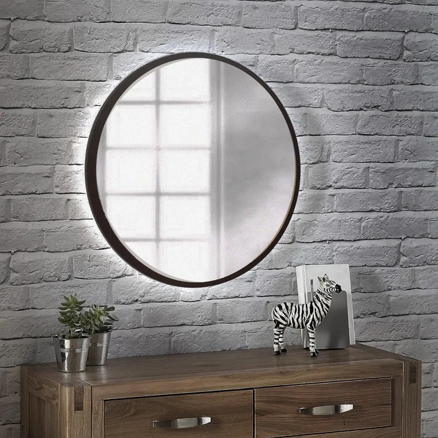 Кругле настінне дзеркало з підсвіткою і сенсорною кнопкою Лайн Ольян діаметром 60 см колір венге
