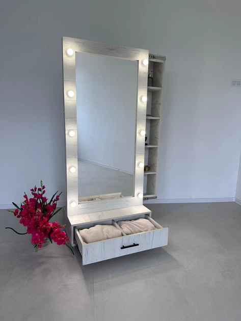 Дзеркало в повний зріст підлогове з поличками висувними шухлядою та підсвіткою 187x80 Дуб крафт білий