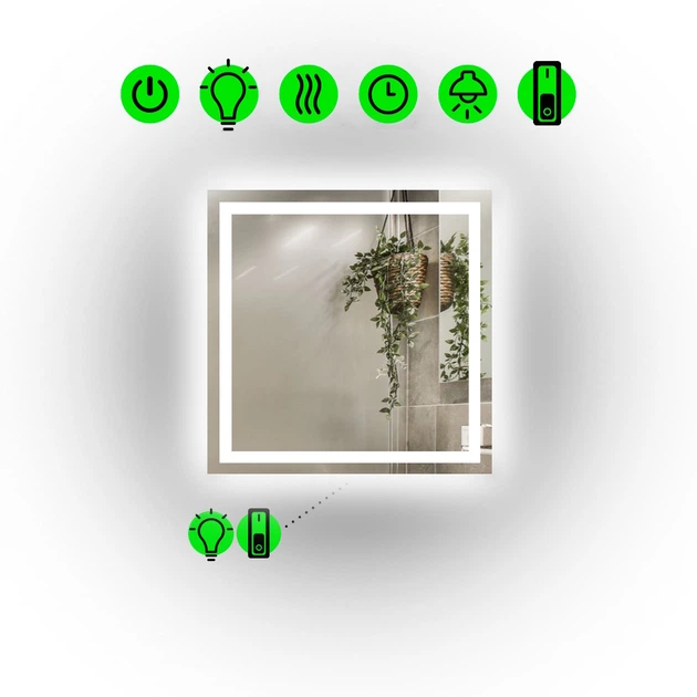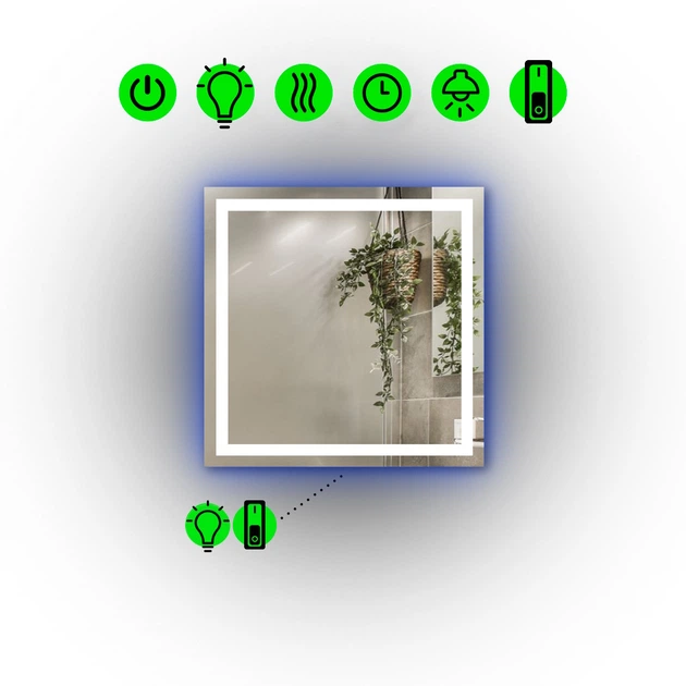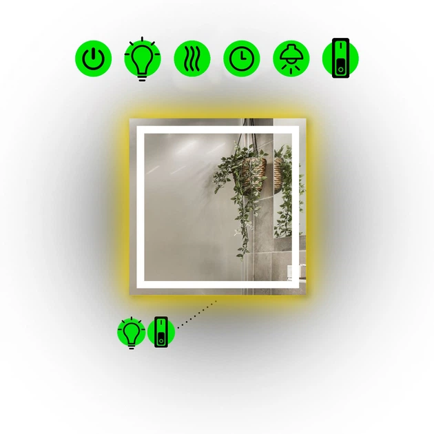 Прямокутне дзеркало з двома LED підсвітками 60 на 60 см, з двома сенсорами, годинником, механічним вимикачем та підігрівом,