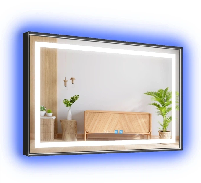 Дзеркало з двома LED підсвітками прямокутне в чорній рамі ПВХ 100 на 60 см, два сенсора, годинник та підігрів дзеркала, моде