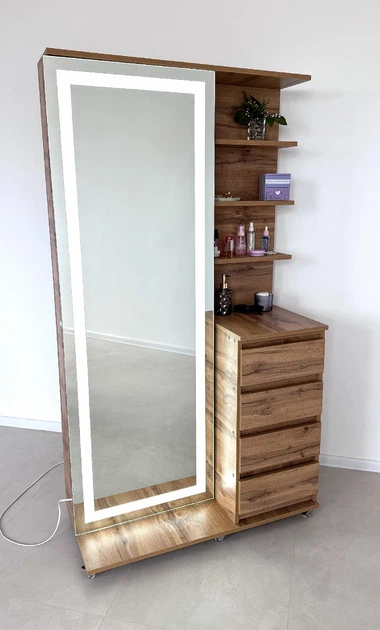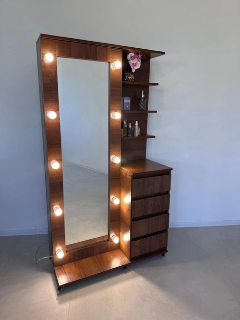 Дзеркало для макіяжу з підсвіткою в повний зріст з шухлядами та поличками 185x100 Горіх еко
