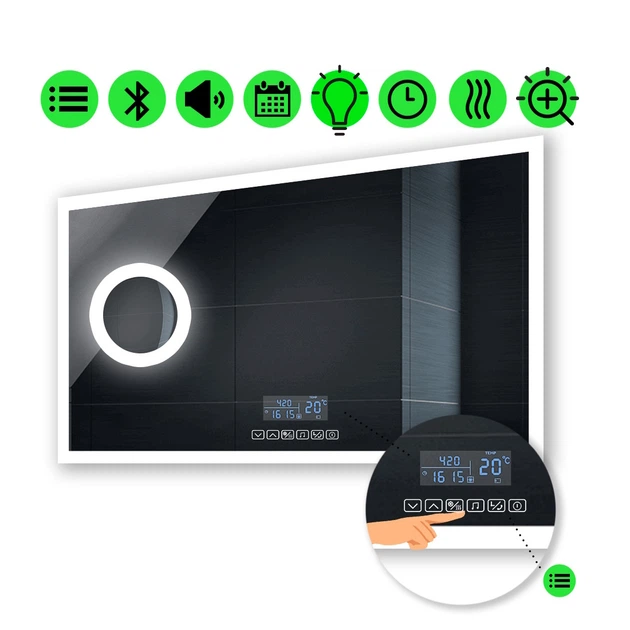 Прямокутне дзеркало з LED підсвіткою 120 на 100 см, з двома сенсорами, годинником та лінзою з підсвіткою, модель Simphony La