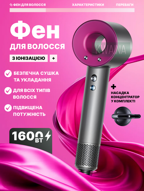 Професійний фен для волосся 1600 вт іонізація повітря, турбо режим, 4 рівні нагріву, 3 швидкості, чорний фуксія