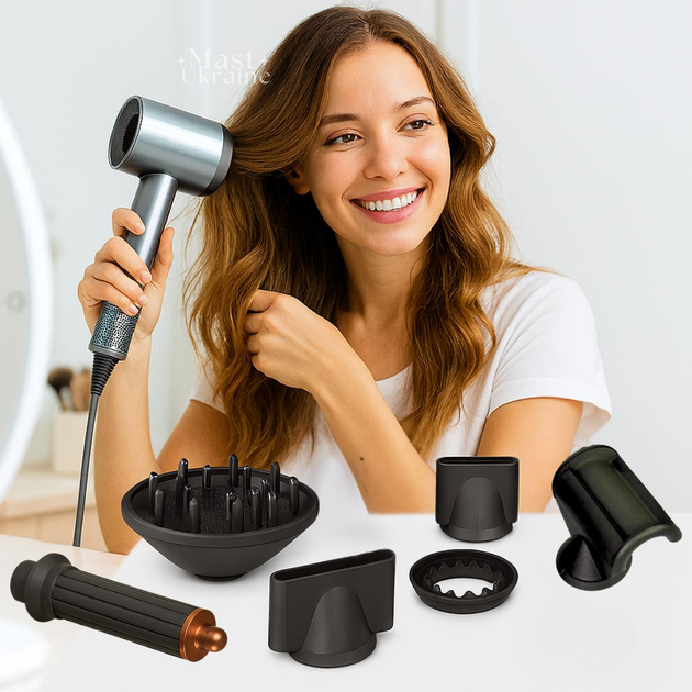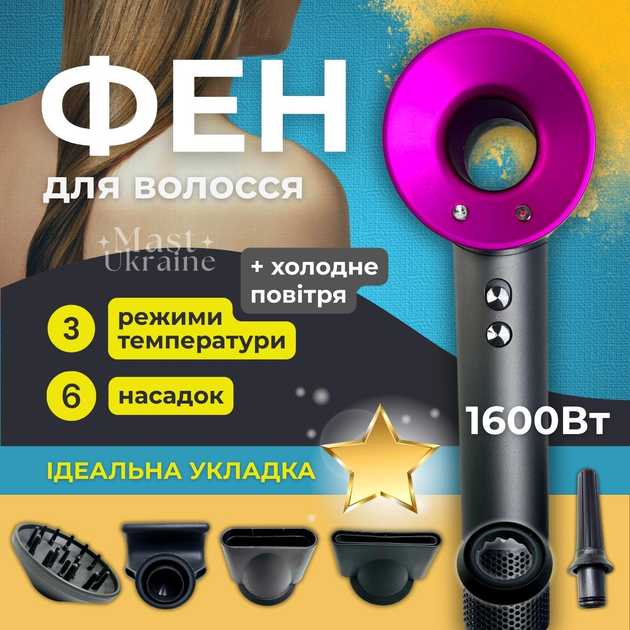 Фен для сушіння та укладання волосся із 6 магнітними насадками Super Hair Dryer 1600Вт, багатофункціональний фен-стайлер 6в1