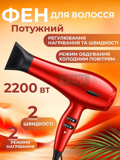 Фен для сушіння волосся з насадкою-концентратором, 2200 Вт, регулювання швидкості повітряного потоку та температури, Червони