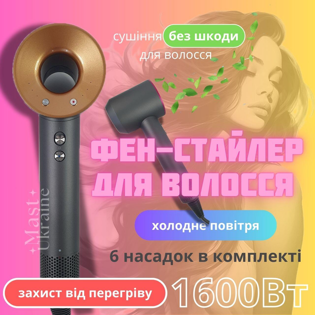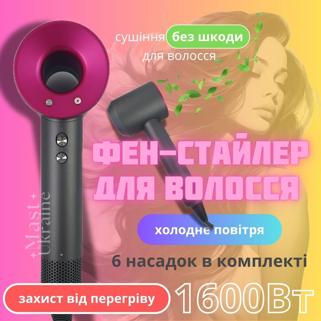 Фен для волосся із 6 магнітними насадками Super Hair Dryer 1600Вт, фен-стайлер 6в1 для сушіння та укладання волосся з 3 темп