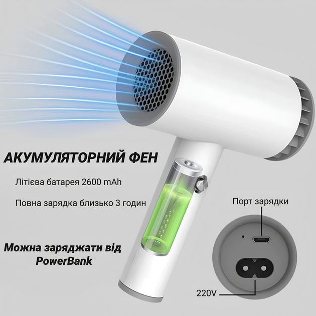 Фен WHD-01 акумуляторний, бездротовий. 500 Вт білий Без насадки (WHD-01-1)