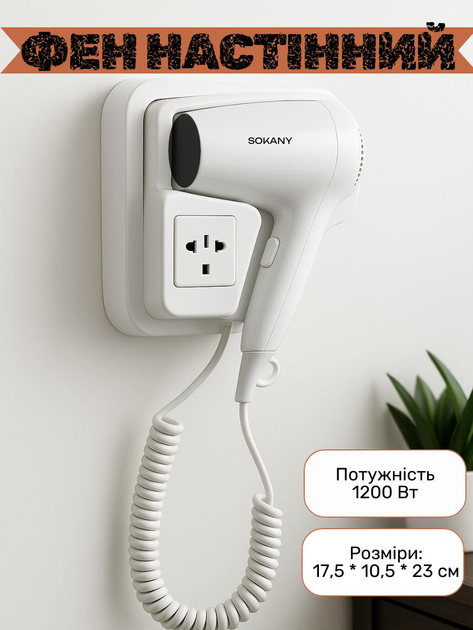 Мережевий настінний фен для волосся SOKANY SK-CF-2217 потужністю 1200 Вт Стаціонарний фен на стіну для готелю чи дому Білий