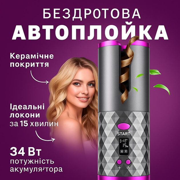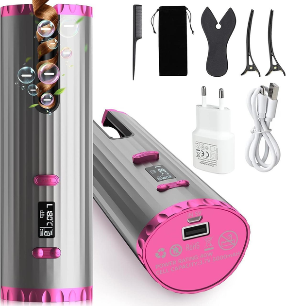 Бездротова автоматична плойка для завивки волосся | автобігуді, локони, кучері, турмалін/кераміка, LED дисплей, акумулятор,