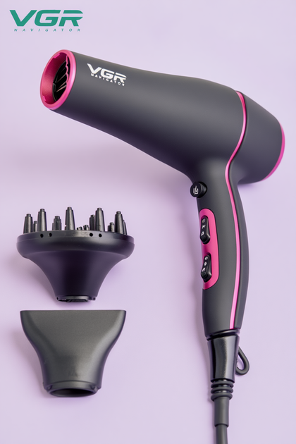 Фен для волосся з дифузором та концентратором VGR 2200 Вт, потужний фен сірий з рожевим
