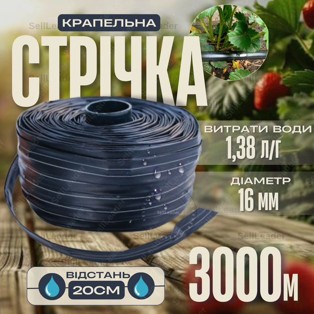 Крапельна стрічка FLORA 16мм плоский емітер для поливу рослин економія води та добрив 3000м 6мил TR5076624
