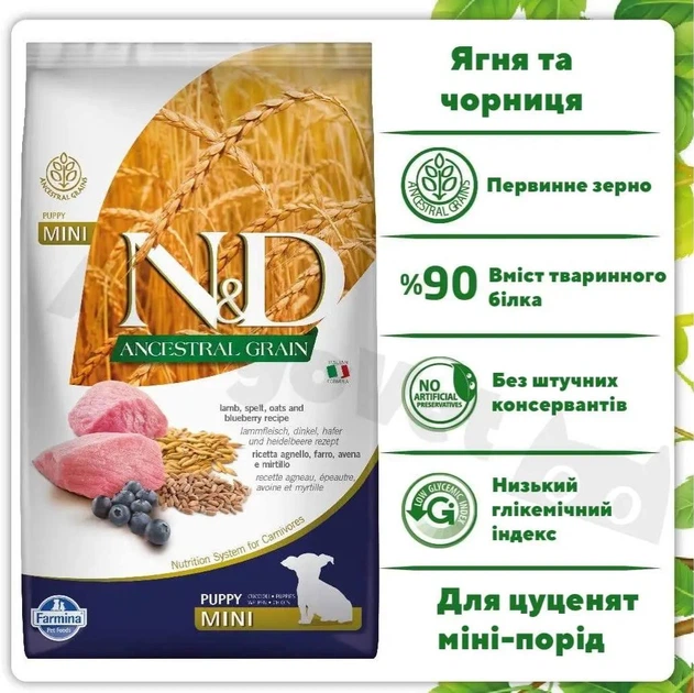 Сухий корм Farmina Dog Low Grain N&D Angestral Grain, Lamb & Blueberry Puppy Mini для цуценят дрібних порід з ягням, спельто