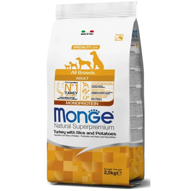 Сухий корм для собак всіх порід Monge Dog All breeds Adult індичка, рис та картопля, 2.5 кг