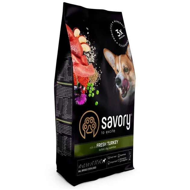 Сухий корм для стерилізованих собак All Breed Sterilised rich in Fresh Turkey зі свіжим м'ясом індички 3 кг Savory
