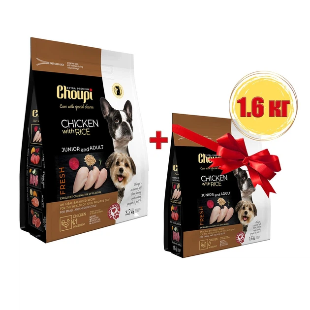 Набір Сухий корм Choupi - для молодих і дорослих собак усіх порід, курка з рисом 3.2 кг + 1.6 кг