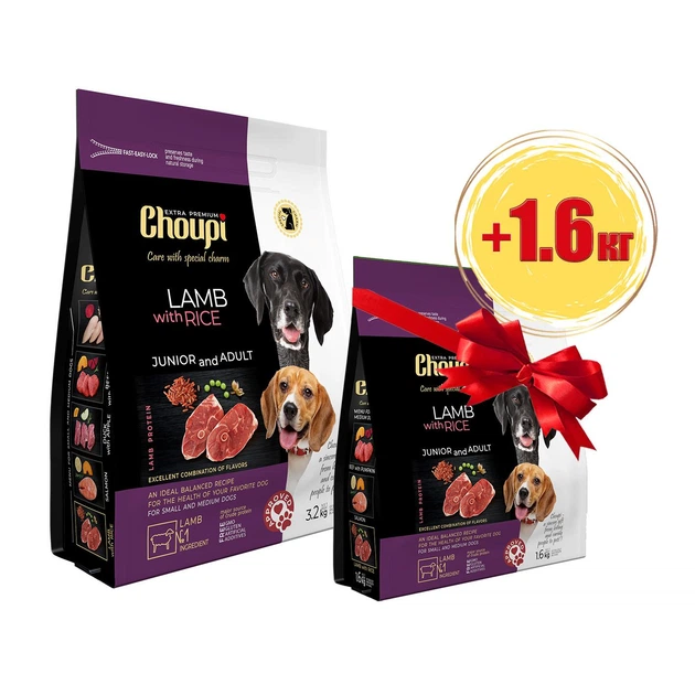 Набір Сухий корм Choupi - для молодих і дорослих собак усіх порід, ягня з рисом 3.2 кг + 1.6 кг