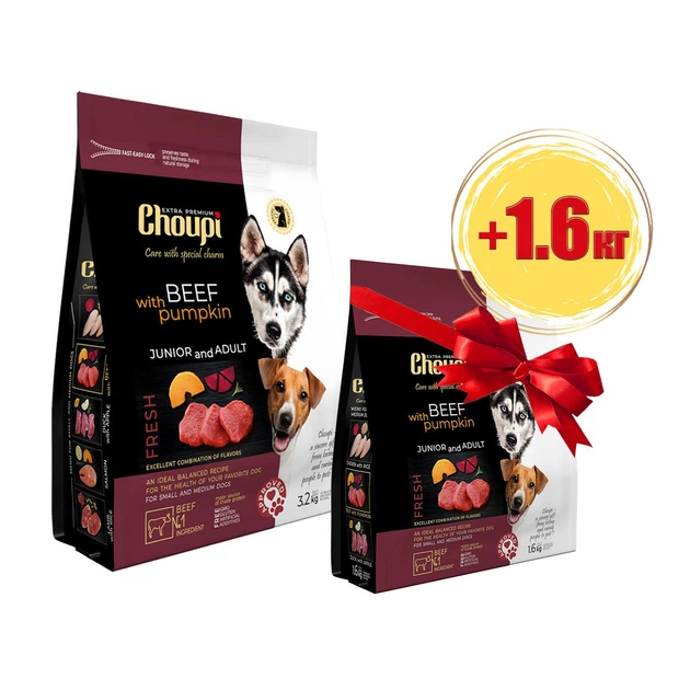 Набір Сухий корм Choupi - для молодих і дорослих собак усіх порід, яловичина з гарбузом 3.2 кг + 1.6 кг