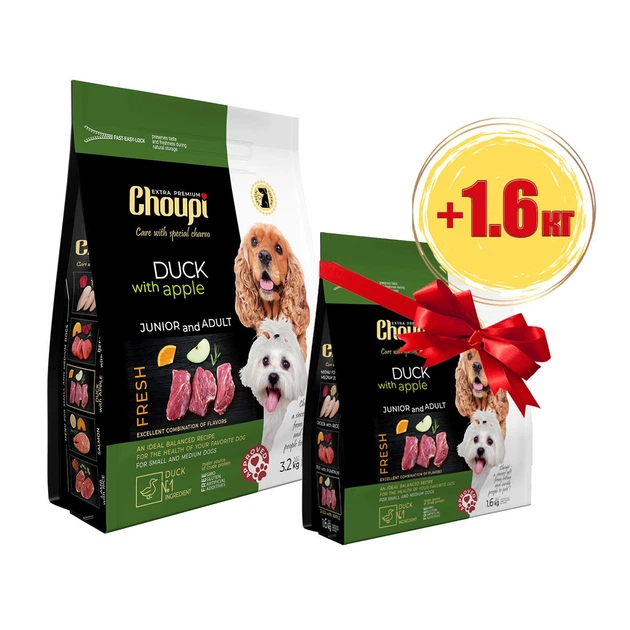 Набір Сухий корм Choupi - для молодих і дорослих собак усіх порід, качка з яблуками 3.2 кг + 1.6 кг
