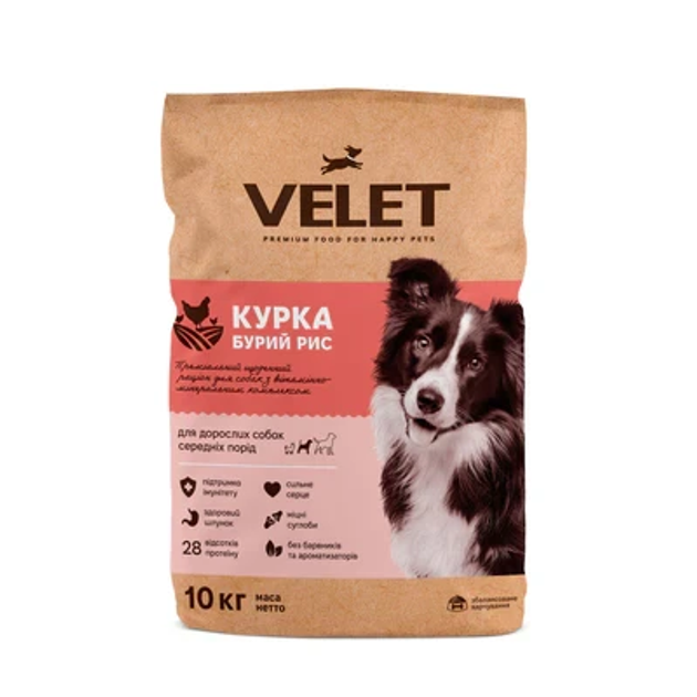 Velet (Велет) - Сухий корм "Куриця та бурий рис" для дорослих собак середніх порід. 10 кг.