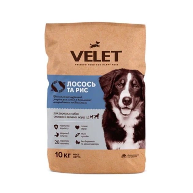 Velet (Велет) – сухий корм "Лосось та рис" для дорослих собак середніх та великих порід. 10 кг.