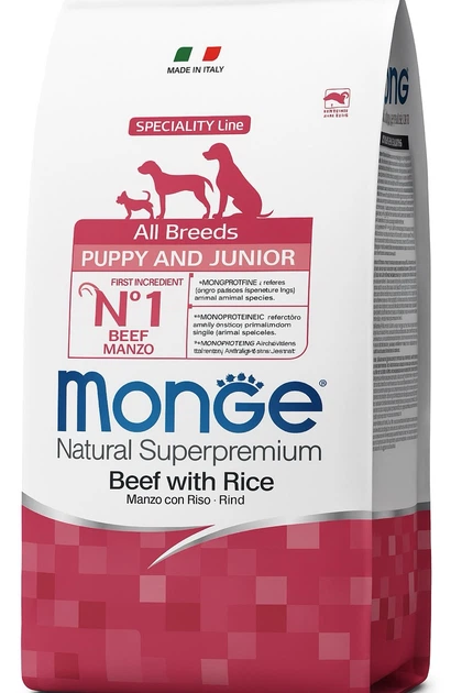 Сухий корм з яловичиною для цуценят Monge Monoprotein All breeds Puppy & Junior Manzo, 15 кг
