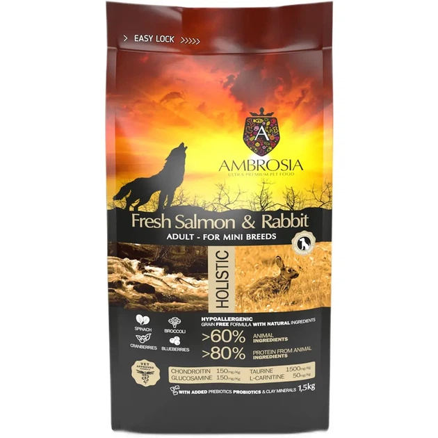 Беззерновий сухий корм Ambrosia Grain Free Dog Adult Mini Sensitive Fresh Salmon & Rabbit для дорослих собак міні порід зі с