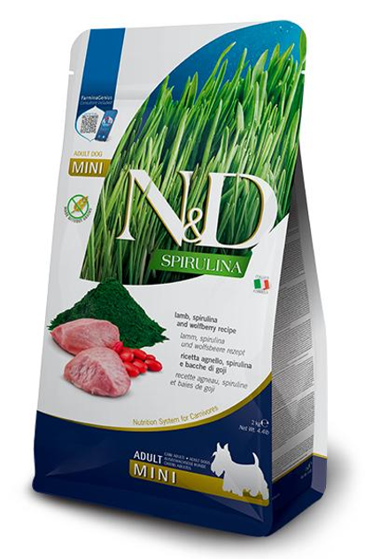Фарміна сухий беззерновий кормдля собак малих порід N&D SPIRULINA LAMB ADULT MINI з ягням, спіруліною та ягодами годжі, 2 кг