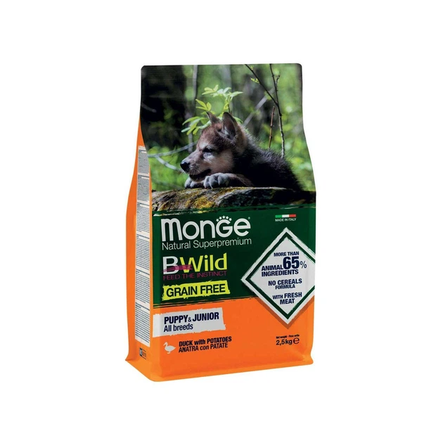 Сухий беззерновий корм Monge Dog Bwild Grain Free Puppy&Junior для цуценят всіх порід з качкою, 2,5 кг