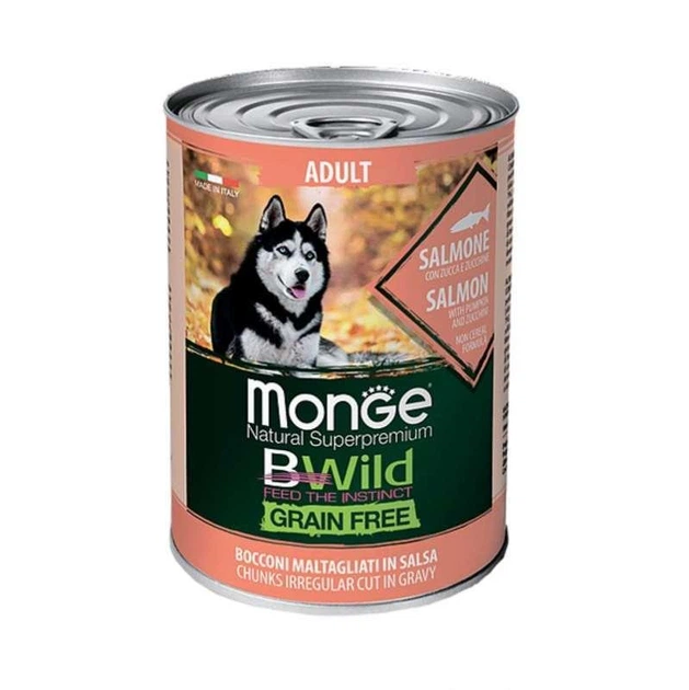 Консервований корм Monge BWild Grain Free Wet Salmon з лосося для собак усіх порід шматочки в соусі 400г