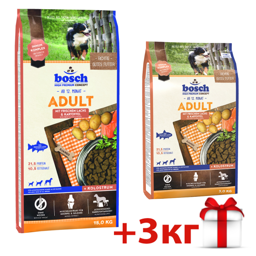 Набір Сухого корма для собак Бош Едалт з Лососем і Картоплею, Bosch Adult Salmon and Potato (15 кг + 3 кг) (А/52090015)