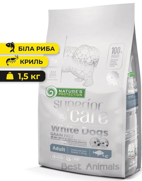 Сухий беззерновий корм Nature's Protection Superior Care для дорослих собак малих порід з білою шерстю, з лососем 1.5 кг
