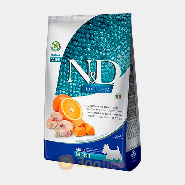 Сухий беззерновий корм Farmina N&D Ocean Cod, Pumpkin & Orange Adult Mini для собак маленьких порід, з тріскою та апельсином