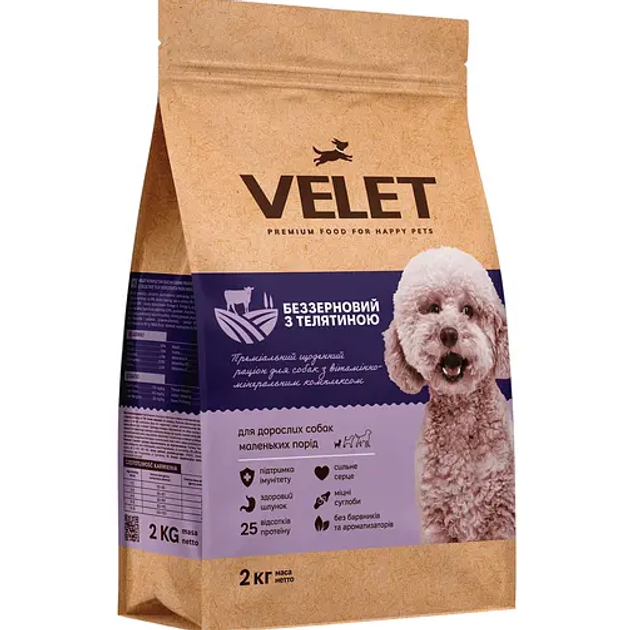 Сухий корм для дорослих собак малих порід Velet (беззерновий з телятиною) - 2кг