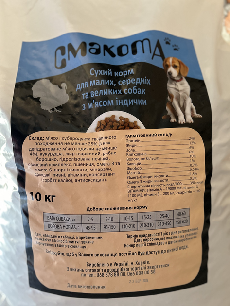 Сухий корм для малих, середніх та великих собак з мясом індички Смакота для дружка 10 кг