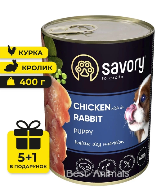 Вологий корм з кроликом та куркою Savory Сейворі консерва для цуценят 400 г 5+1 шт (4820232630587)