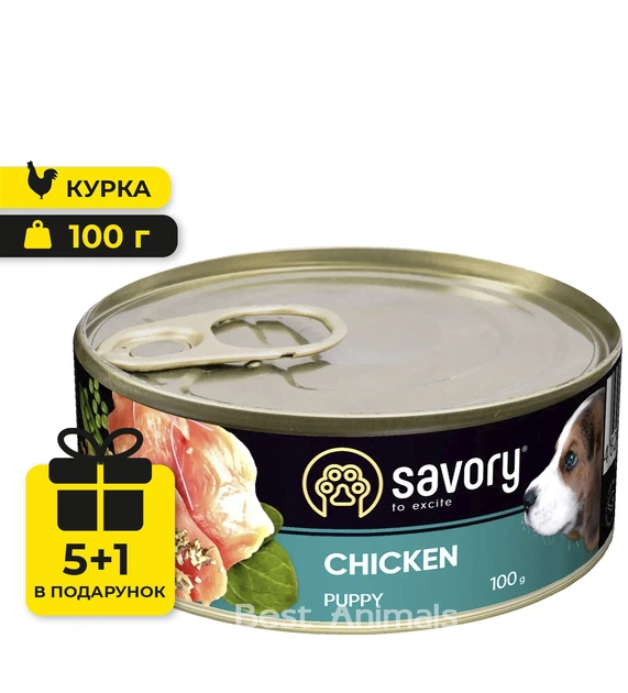 Вологий корм з куркою Savory Сейворі консерва для цуценят 100 г 5+1 шт (4820232630532)