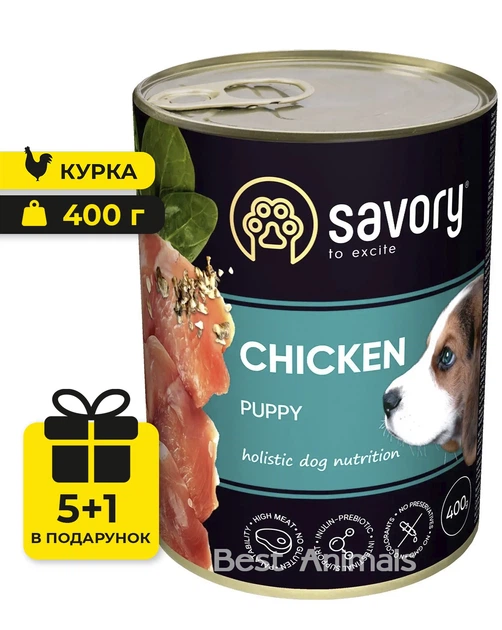 Вологий корм з куркою Savory Сейворі консерва для цуценят 400 г 5+1 шт (4820232630532)