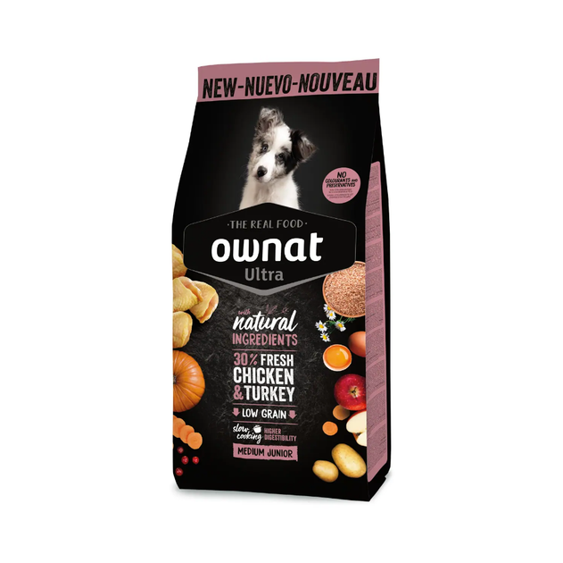 Сухий корм для цуценят середніх порід OWNAT ULTRA MEDIUM JUNIOR (низькозерновий) з куркою та індичкою - 12кг